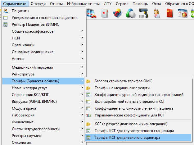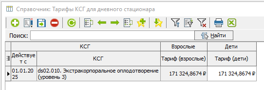 Рассчитанный по формуле тариф в КСАМУ находится в пункте меню "Справочники" - "Тарифы (Брянская область)" - "Тарифы КСГ для дневного стационара" (рисунок 9-10). Для проверки тарифу необходимо рассчитать сумму по формуле и проверить с внесенными в программу данными.