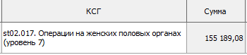 Для примера возьмем КСГ дневного стационара "st25.009. Операции на сосудах (уровень 2)" с уже рассчитанной суммой 155 189,08 (рисунок 4).