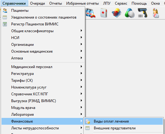 Для работы со справочником видов оплаты необходимо выбрать пункт меню "Справочники" → "Финансовые" → "Виды оплат лечения" (рисунок 1).