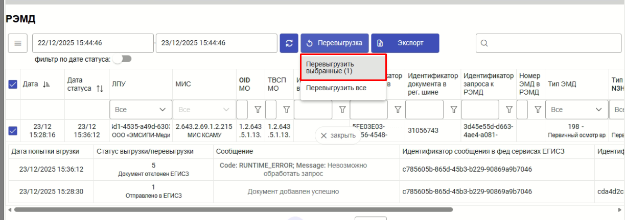 Выделить галочкой нужные документ как на рисунке 5, и нажать кнопку перевыгрузка
