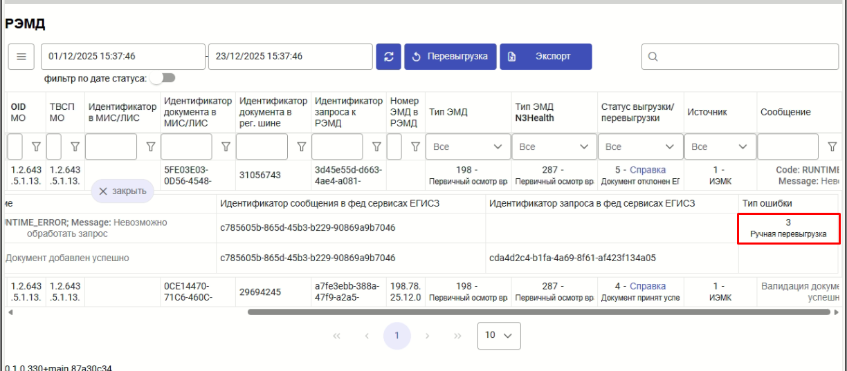 Если в строке прописан тип ошибки "Ручная перевыгрузка" необходимо выполнить следующие действия (рисунок 4).