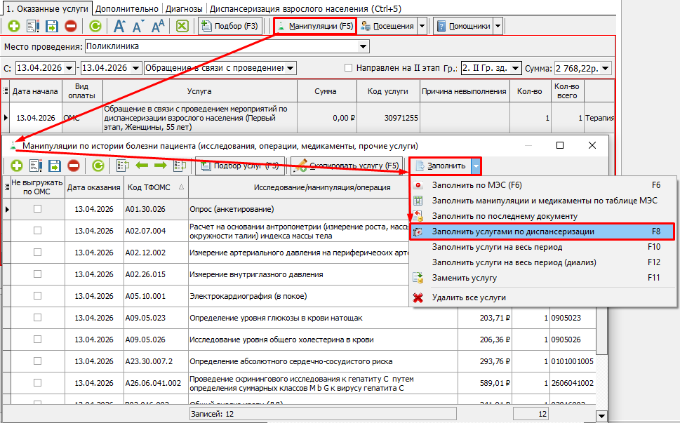После выбора группы здоровья необходимо нажать на кнопку "Манипуляции" или нажать горячую клавишу F5 (рисунок 4). В открывшемся окне нажать на кнопку "Заполнить" и выбрать из выпадающего списка вариант "Заполнить услугами по диспансеризации" или нажать горячую клавишу F8.