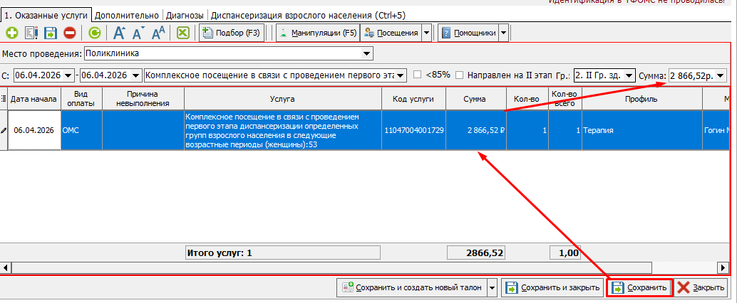 При сохранении карты автоматически добавится комплексная услуга (рисунок 7). Цена комплексной услуги фиксированная и определена в приложениях 10 и 11 тарифного соглашения.