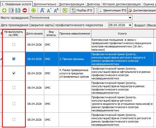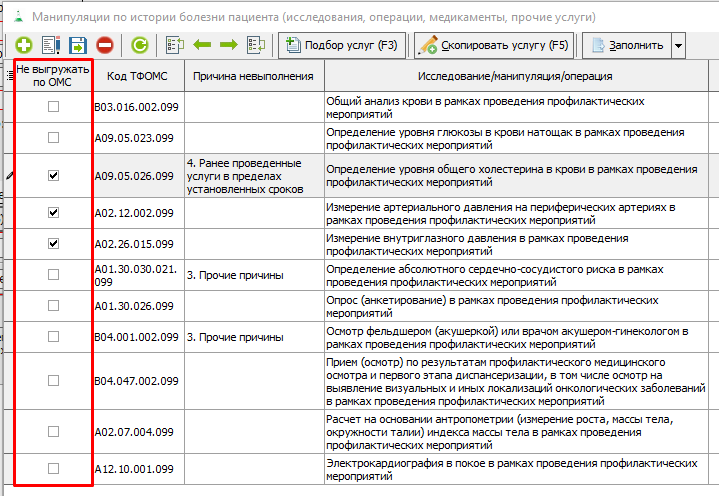 ВАЖНО!!! Нельзя удалять невыполненные услуги из списка или ставить им отметку "Не выгружать по ОМС!" (рисунок 15, 16). В таком случаи сумма невыполненных услуг не будет вычитаться из тарифа комплексной услуги.