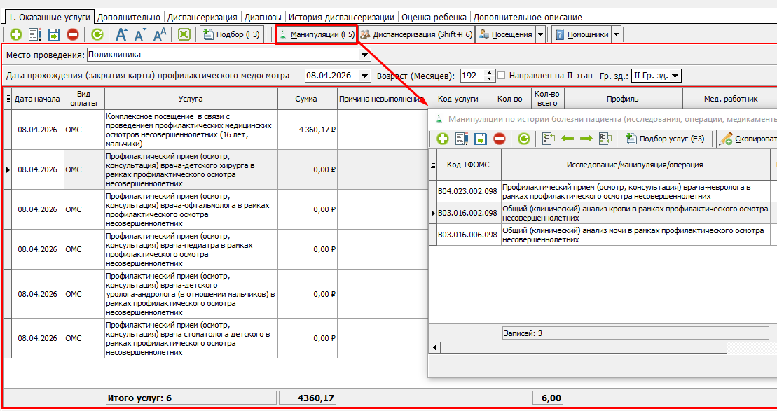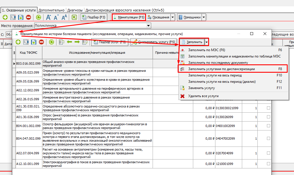 После выбора группы здоровья необходимо нажать на кнопку "Манипуляции" или нажать горячую клавишу F5 (рисунок 6). В открывшемся окне нажать на кнопку "Заполнить" и выбрать из выпадающего списка вариант "Заполнить услугами по диспансеризации" или нажать горячую клавишу F8.
