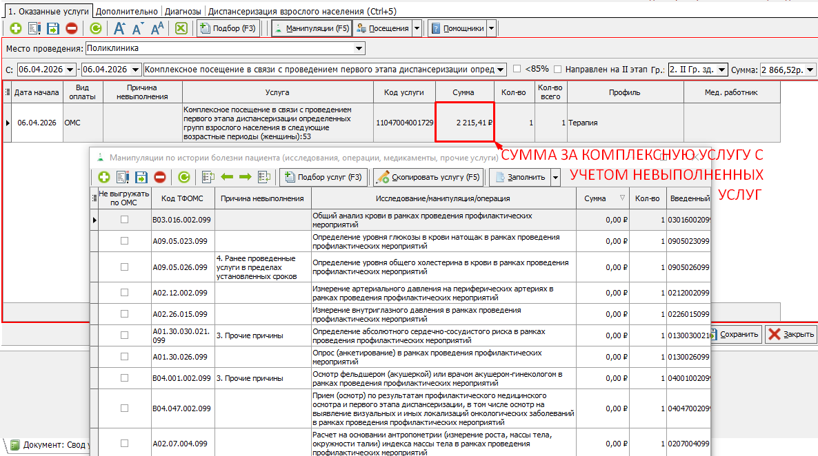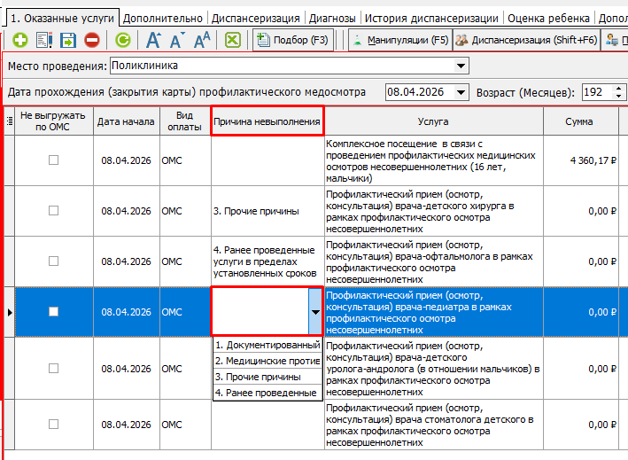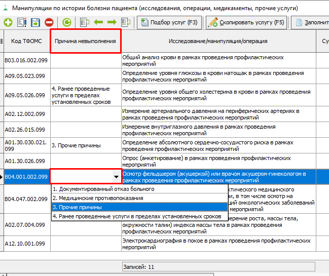 У услуг, которые не были выполнены в рамках диспансеризации/профосмотров, обязательно нужно проставить в поле "Причина невыполнения" причину, по которой эта услуга не была оказана пациенту (рисунок 12, 13). При таком оформлении сумма невыполненной услуги будет отниматься от тарифа за комплексную услугу (рисунок 14).