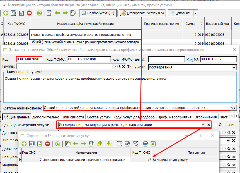 Для диспансеризации/профосмотров детей отнесение услуг к манипуляция зависит от единицы измерения. Если у услуги единица измерения "7 Исследования, манипуляции в рамках диспансеризации" (рисунок 19), то она будет добавлена в "Манипуляции".