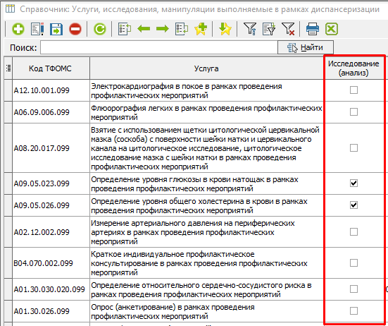 Отнесение услуг по диспансеризации/профосмотрам взрослых пациентов к табличной части вкладки "Оказанные услуги" или в блок "Манипуляции" обуславливается простановкой чек-бокса "Исследование (анализ)" в справочнике "Услуги, исследования, манипуляции выполняемые в рамках диспансеризации" (рисунок 17). Для того, что бы открыть справочник нужно перейти в меню "Справочники" - "Номенклатура услуг" - "Услуги, исследования, манипуляции выполняемые в рамках диспансеризации" (рисунок 18).