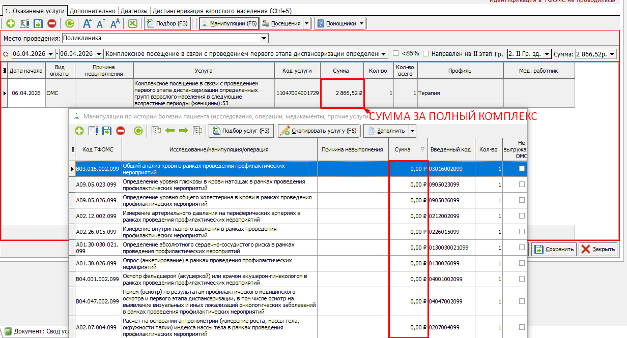 Если какая-то услуга из комплекса не была оказана пациенту в рамках прохождения диспансеризации/профосмотров, то сумма за нее должна быть вычтена из тарифа комплексной услуги. В КСАМУ по требованию фонда ОМС реализовано отображение суммы за комплексную услугу и нулевые суммы за составные услуги, входящие в эту комплексную услугу (рисунок 11):