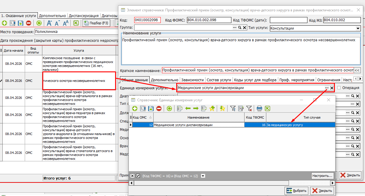 Если у услуги единица измерения "12 Медицинские услуги диспансеризации" (рисунок 20), то она будет добавлена в табличную часть вкладки "Оказанные услуги".