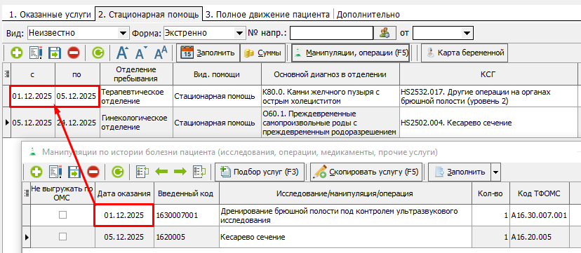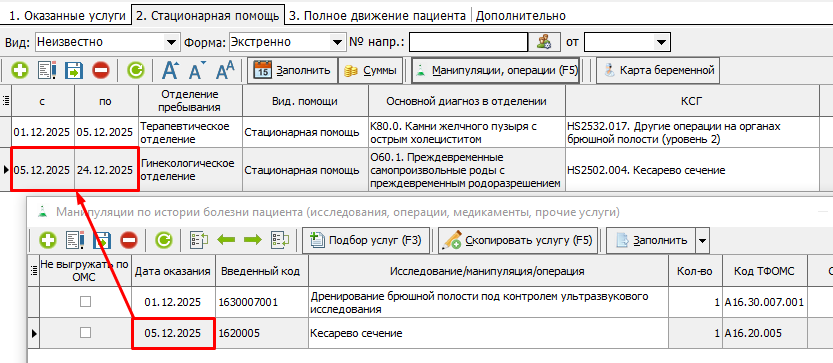 2. В манипуляциях необходимо указать услугу для первого КСГ. Услуга должна входить в период лечения по первому КСГ (рисунок 4).