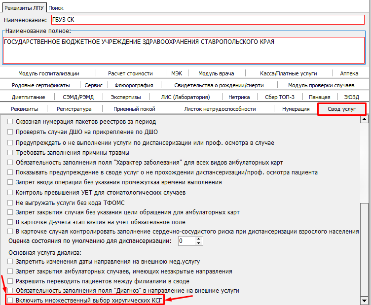 Для корректного подбора двух хирургических КСГ в карте необходимо включить настройку в параметрах ЛПУ (рисунок 1). В открывшемся окне нужно перейти на вкладку "Свод услуг" и активировать настройку "Включить множественный выбор хирургических КСГ" (рисунок 2) и нажать кнопку "сохранить и закрыть" (рисунок 3).