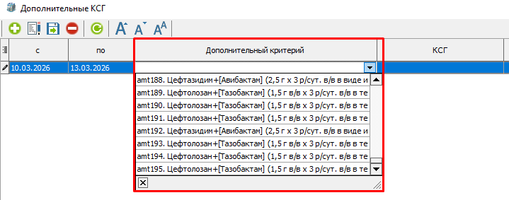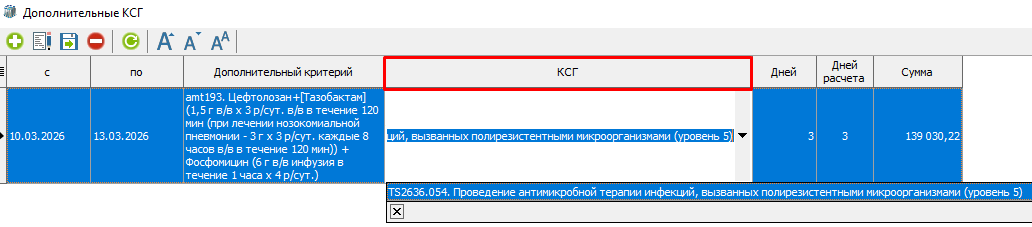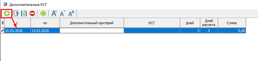 3. Открыть окно для ввода дополнительного КСГ с помощью кнопки "Подбор доп. КСГ" (рисунок 1). С помощью кнопки добавления нового элемента "+" добавить новую строку (рисунок 3). Проставить даты проведения антимикробной терапии.
